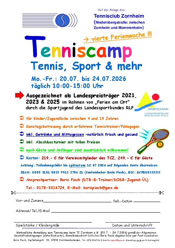 Unser Sport- und Tenniscamp vom 03.08.2026 bis 07.08.2026 (vierte Woche der Sommerferien 2026 in RLP) auf der grünen Anlage des TC Zornheim e.V. (Niedernbergstaße, außerhalb zwischen Zornheim und Mommenheim) ist für jugendliche Mitglieder des TC Zornheim e.V. und auch für willkommene Nicht-Mitglieder im Alter von 4 bis 19 Jahren konzipiert. Unsere Zielgruppe sind (pure) Anfänger (diese sind ausdrücklich willkommen; Tennisschläger können kostenfrei gestellt werden, sollte noch kein eigener vorhanden sein), Fortgeschrittene und natürlich auch "Profis".