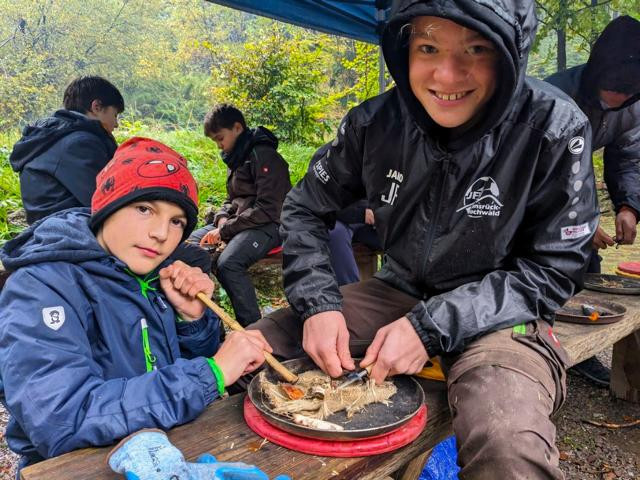 Sobald das Lager steht und womöglich bereits das erste Lagerfeuer entfacht ist, wird die Umgebung erkundet und vielfältige Outdoorerfahrungen gesammelt und erprobt. Was genau, das entscheiden vor allem die großen Säulen des Survivals (Feuer, Wasser, Food, Shelter). Freut euch weiter auf kreatives Bushcraften (z.B. Schnitzen und Glutbrennen von eigenem Geschirr), sicheres Erklettern der höchsten Bäume des Waldes, wilde Nachtgeländespiele und noch vieles mehr. Schlaft nachts im 1000-Sterne-Hotel namens "Wald" im eigenen Biwak und lernt die nächtlichen Geräusche des Waldes kennen. Erfahrt, wie ihr euch hier bestmöglich unbemerkt von Mensch und Tier fortbewegen könnt und wie wohlig ein Lagerfeuer an kalten Tagen sein kann.