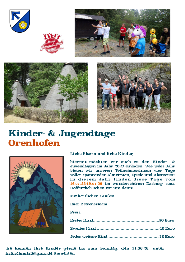 Die Ortsgemeinde Orenhofen bietet wie jedes Jahr den Teilnehmer:innen vier Tage voller spannender Aktivitäten, Spiele und Abenteuer!